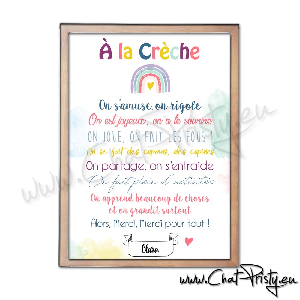 Cette affiche douce et colorée est conçue comme un cadeau unique pour une nounou, une crèche ou une MAM. Illustrée d’un arc-en-ciel pastel et d’un texte chaleureux, elle décore joliment un espace dédié aux enfants. Le prénom de votre enfant est ajouté pour en faire une création vraiment personnelle.