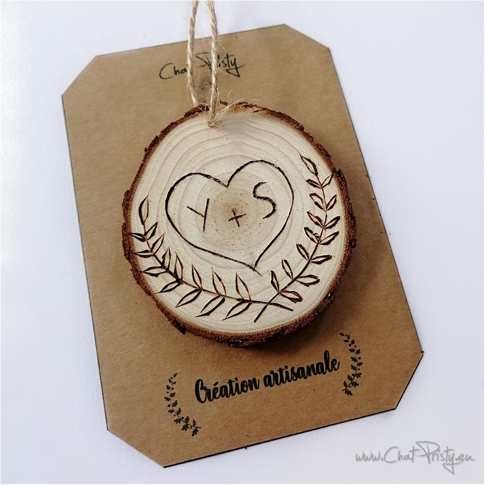 Avant d’ajouter la décoration au panier, inscrivez les deux lettres souhaitées : elles seront pyrogravées à la main dans un cœur gravé sur le rondin de bois.