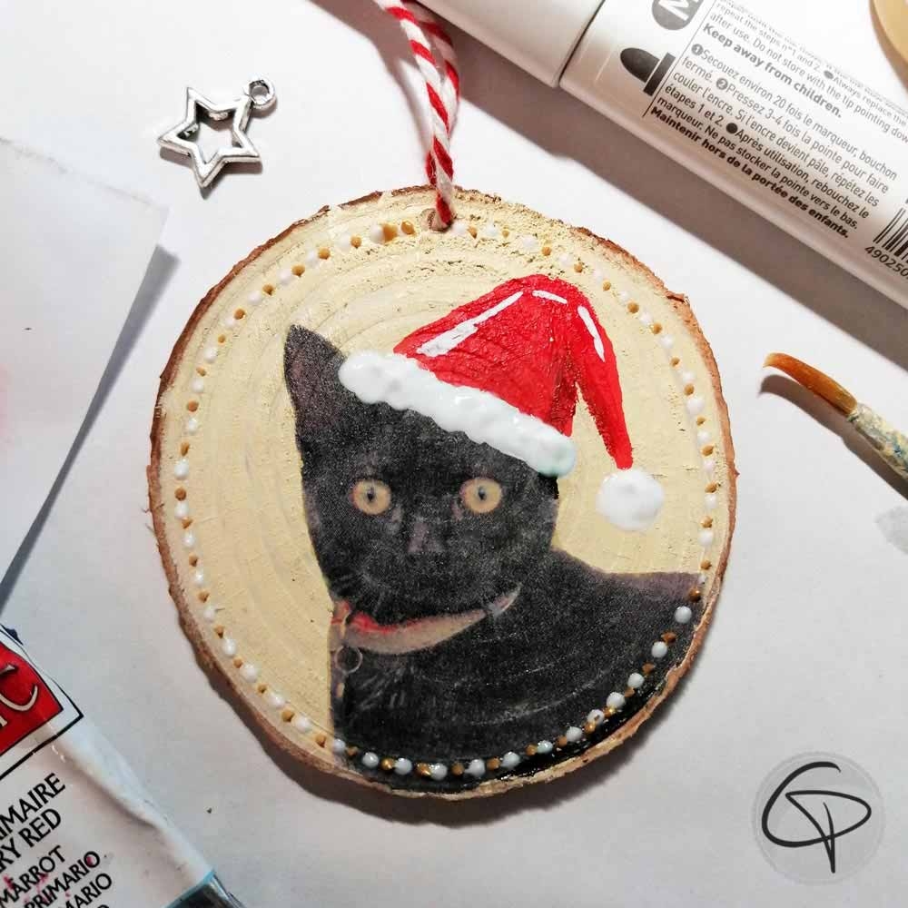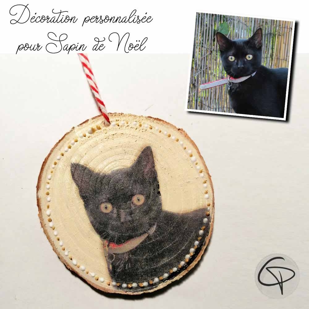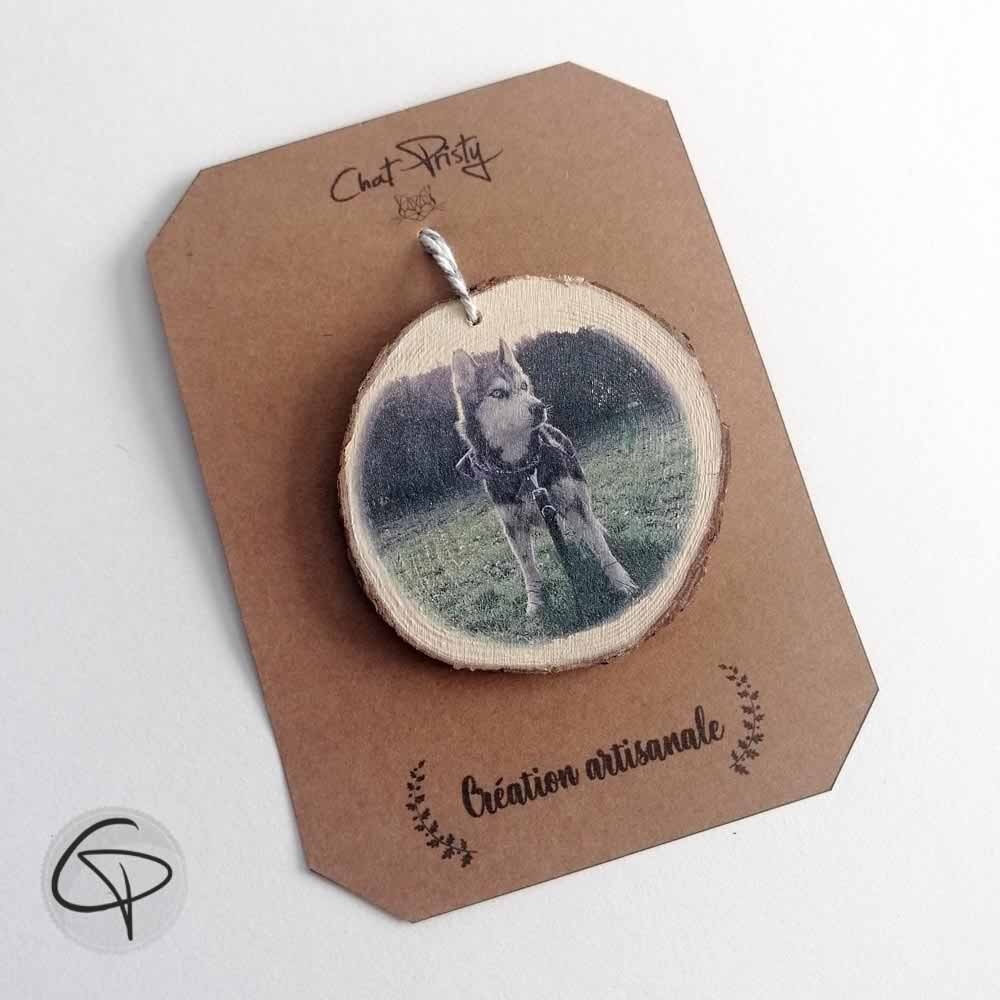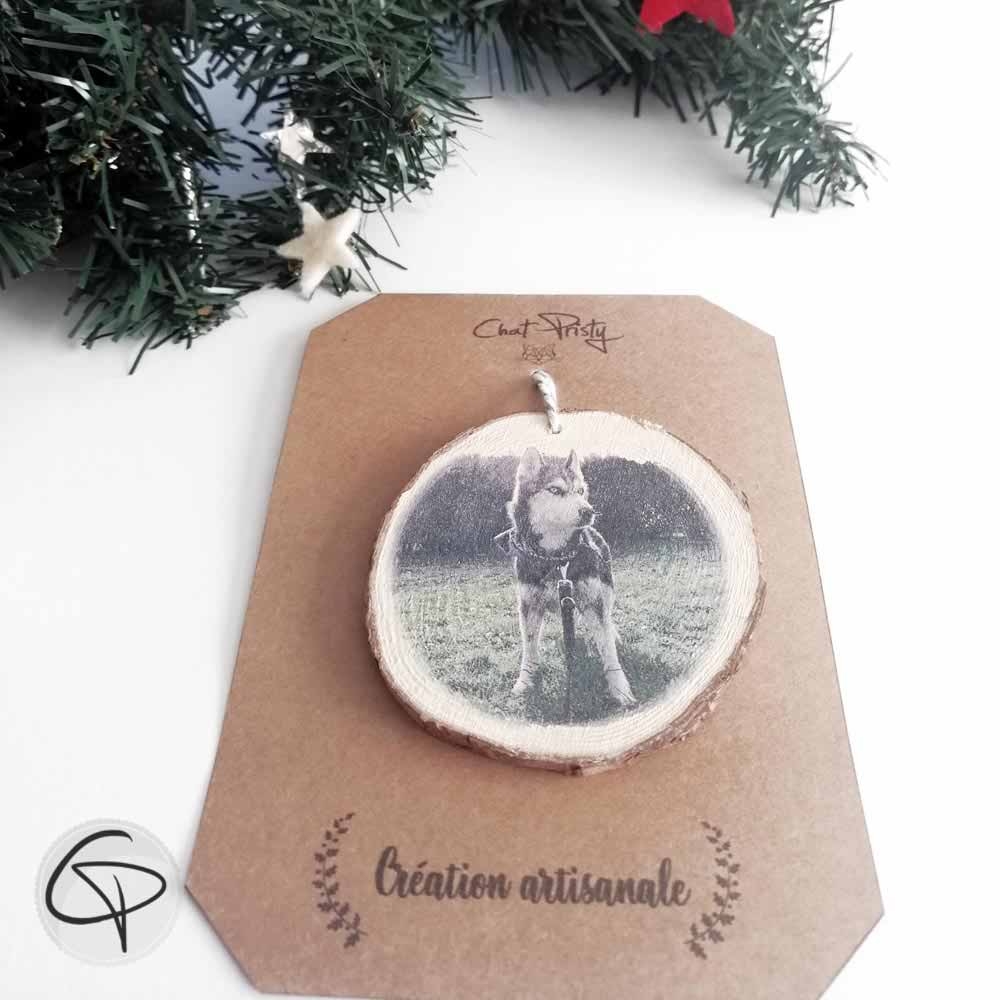 Offrez une décoration de Noël unique avec la photo de votre animal imprimée sur un rondin de bois véritable.