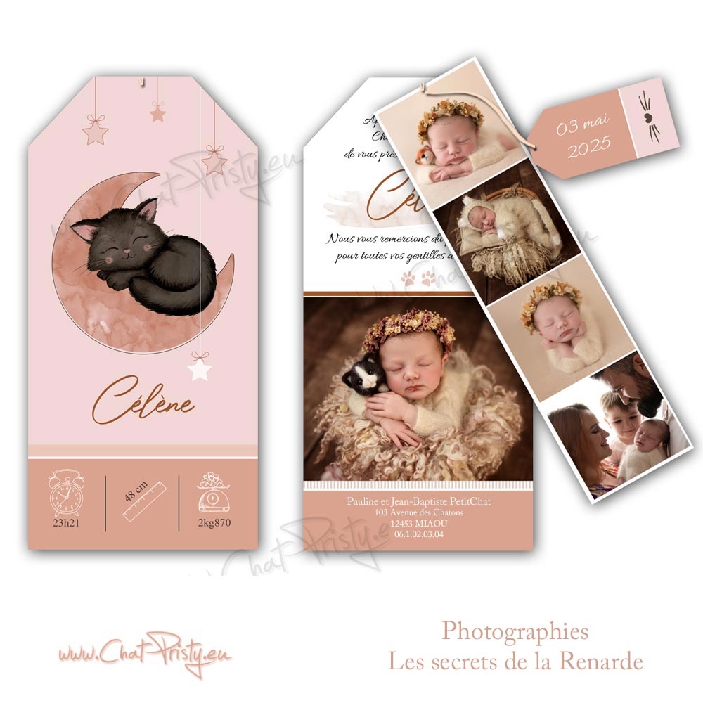 Une lune rose se pose avec douceur pour annoncer votre petite merveille. Ce faire-part de naissance pour petite fille, illustré d’un chaton endormi, est peint à l’aquarelle et personnalisé dans l’atelier Chat Pristy. Fond rose ou blanc, étiquette satin ou bande photomaton : un souvenir tendre et raffiné pour partager la plus belle des nouvelles.