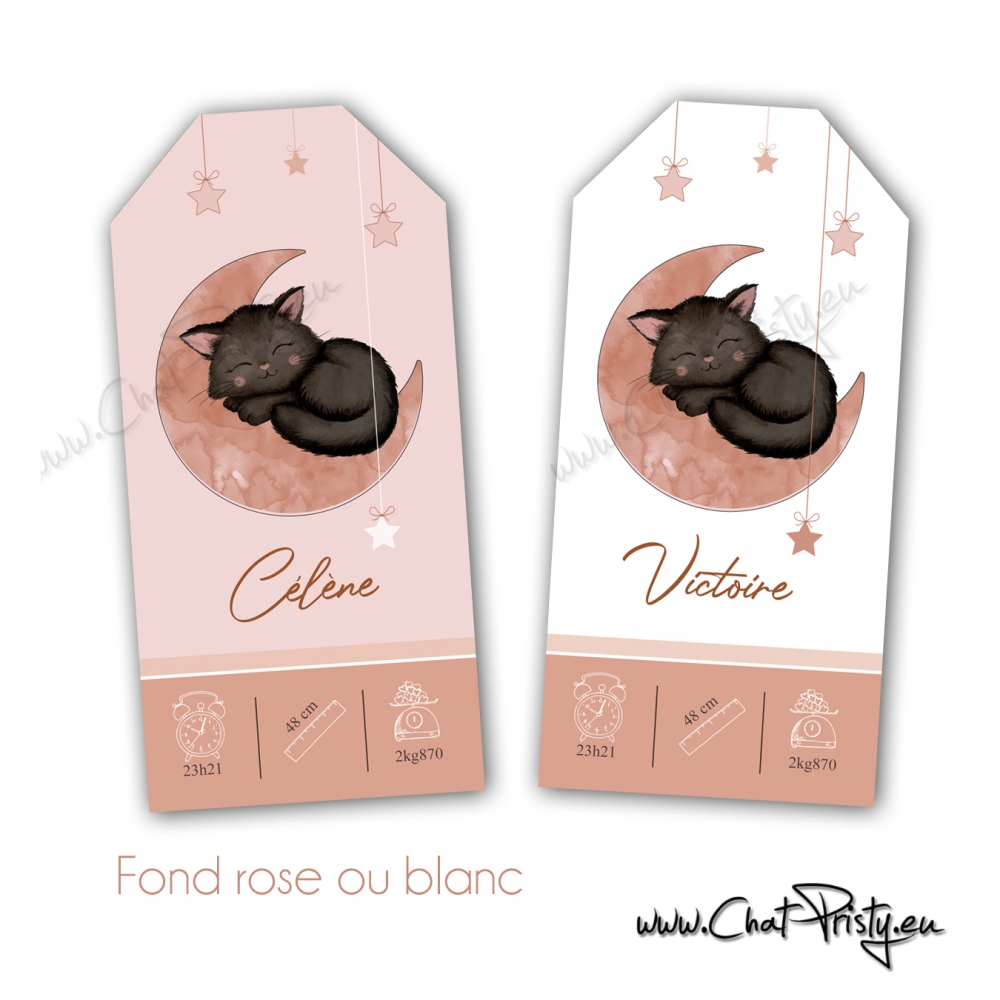 L’étiquette comprend la date de naissance et est fixée avec un ruban satin rose. Sans étiquette, la date est imprimée sous le prénom.