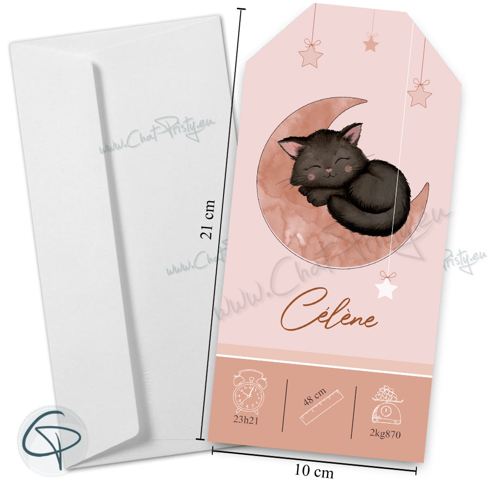 Ce modèle met en scène un chaton noir endormi sur une lune rose, illustré à l’aquarelle par la créatrice Chat Pristy. Pensé exclusivement pour une petite fille, ce faire-part mêle douceur, poésie et teintes poudrées pour célébrer son arrivée de la plus tendre des façons.
