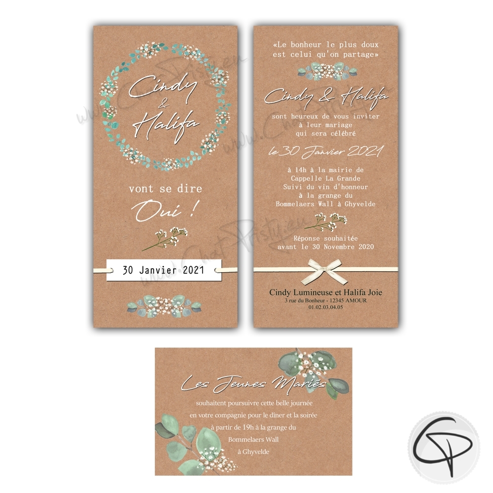 Oui, il est possible d’ajouter un carton dîner ou un carton brunch coordonné au thème eucalyptus kraft.