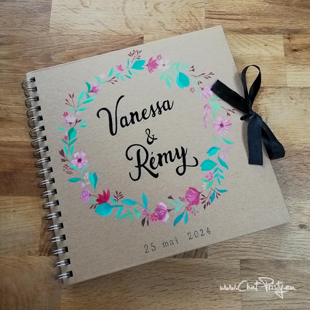 Un livre d’or de mariage personnalisé, illustré dans l’atelier Chat Pristy.