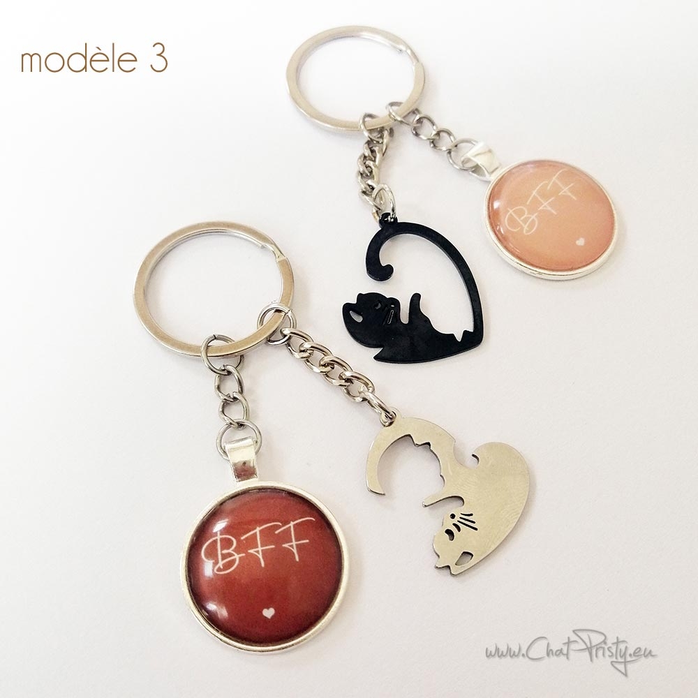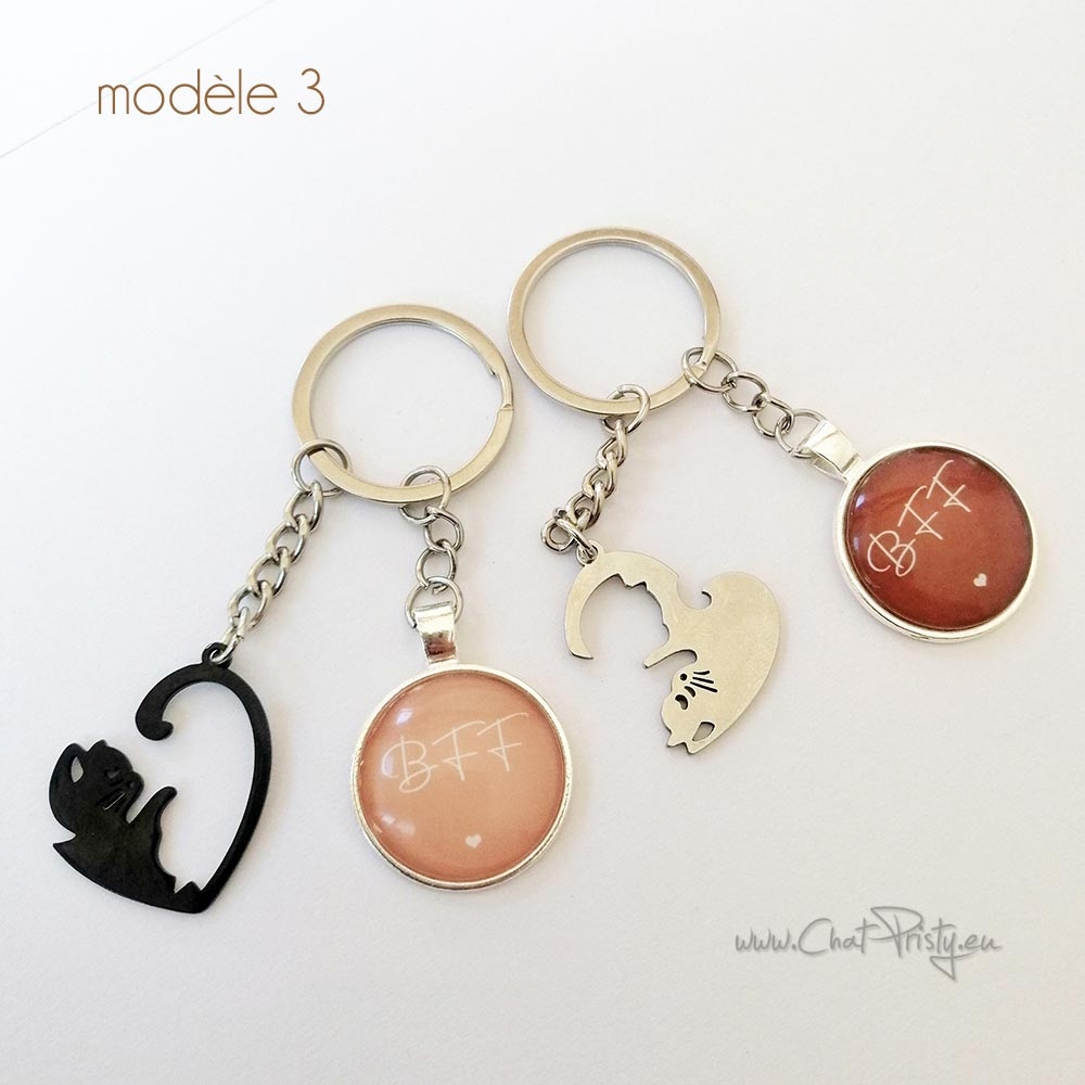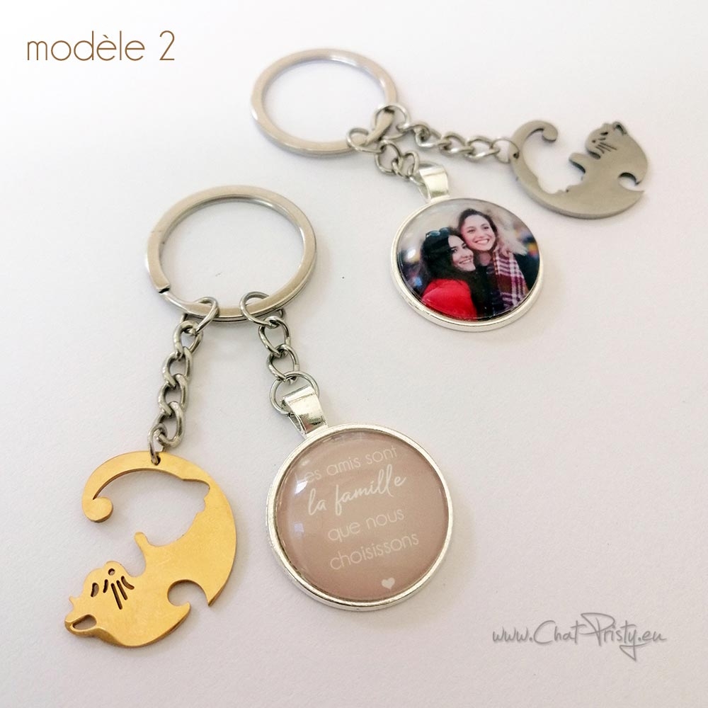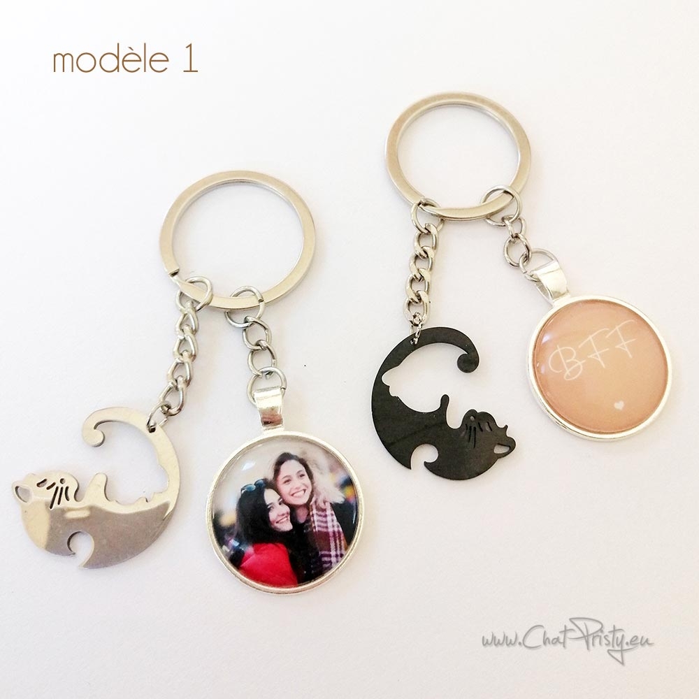 Ces porte-clés BFF forment un duo assorti avec leurs chats Yin Yang et un médaillon photo ou message, créés et assemblés à la main par Chat Pristy.