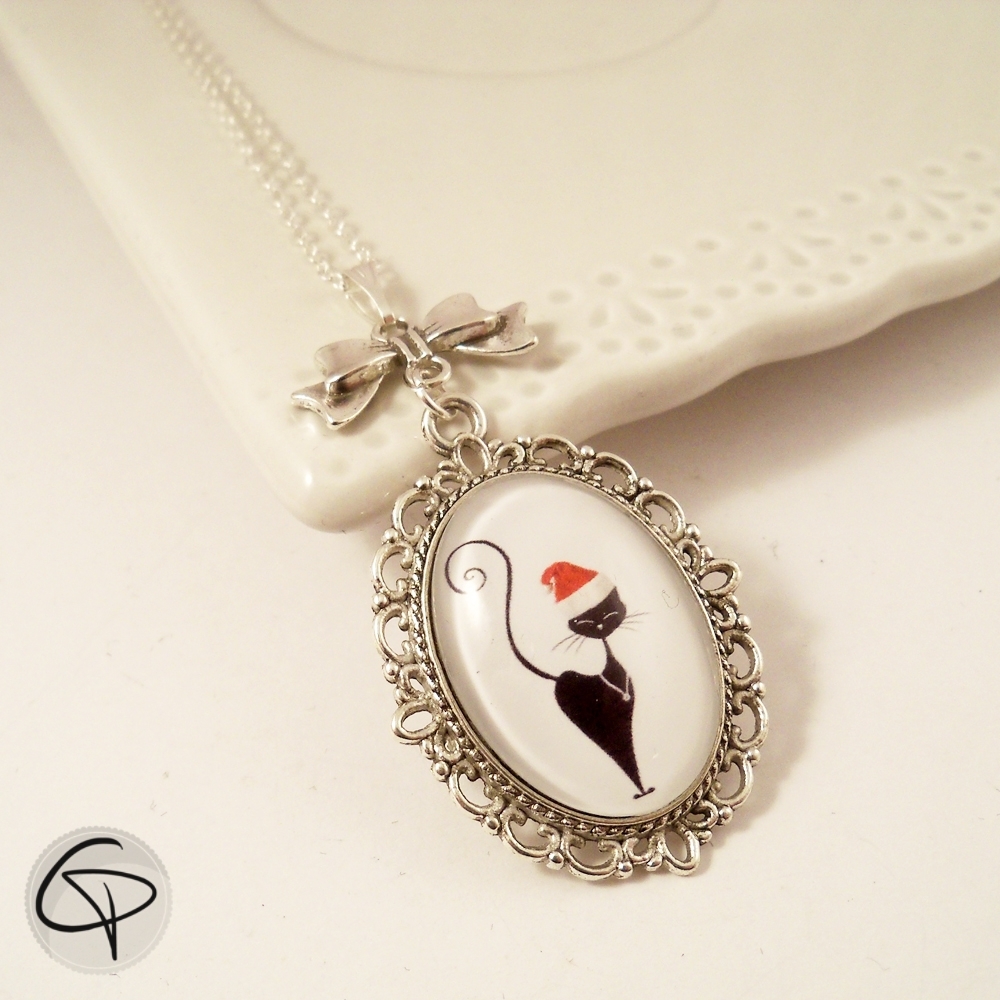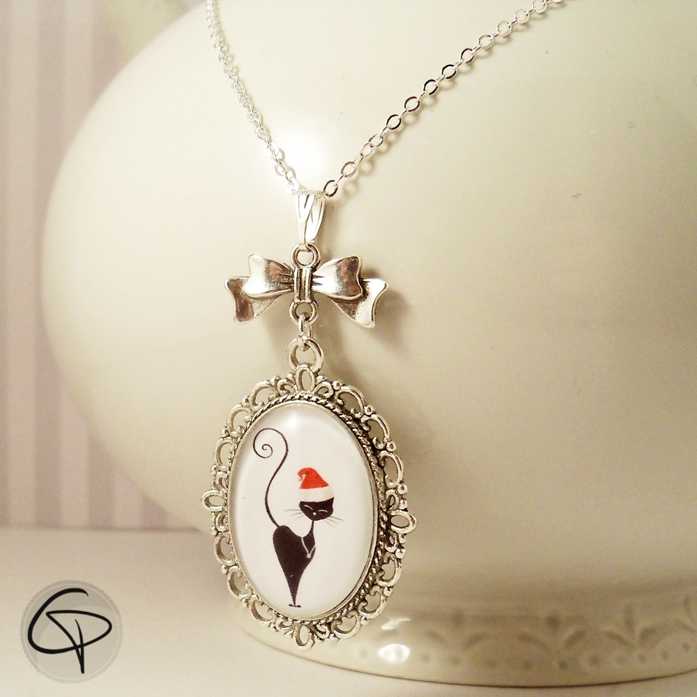Ce bijou pour femme allie l’élégance d’un sautoir argenté et la douceur festive d’un chat noir coiffé d’un bonnet de Noël. Illustré par Laura Lefebvre puis placé sous cabochon, ce pendentif félin original devient un accessoire unique à offrir pour les fêtes.